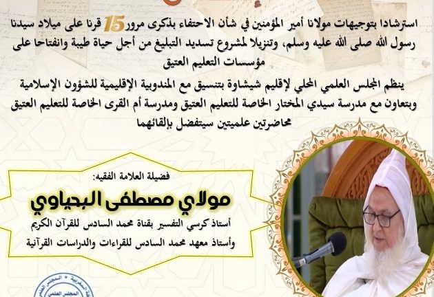 في إطار تخليد الذكرى الخامسة عشرة لمرور خمسة عشر قرناً على ميلاد سيدنا محمد صلى الله عليه وسلم، وبتوجيهات أمير المؤمنين، ينظم المجلس العلمي المحلي لإقليم شيشاوة، بتنسيق مع المندوبية الإقليمية للشؤون الإسلامية، سلسلة من الأنشطة العلمية والدينية الهادفة إلى نشر القيم الإسلامية وتعزيز الوعي الديني داخل المجتمع.